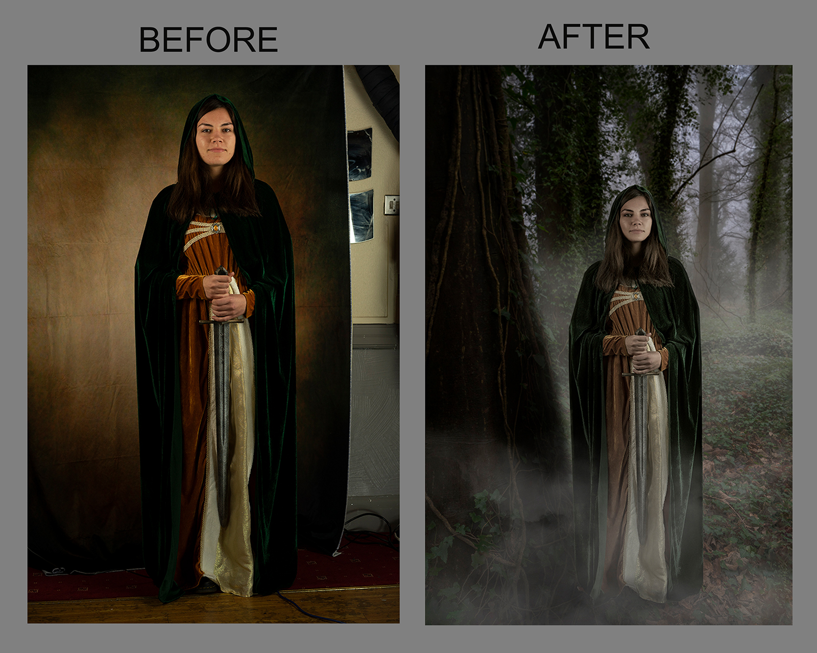Had a great night at Prestatyn CC running a live photographic event. The club gave a generous warm reception for us both: what a lovely, interactive bunch of people! We set up a budget lighting system and photographed Alice, a member of the audience. After the break, we showed how to convert the raw photo into a composite image. Live photoshop work is a bit challenging in front of an audience but all went well and ran to time. The before and after image is shown here.